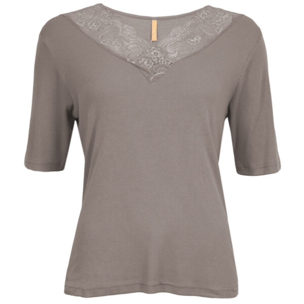Den bløde, ribstrikkede kvalitet giver en behagelig pasform, mens den fine blondeindsats ved halsudskæringen tilføjer et elegant twist.